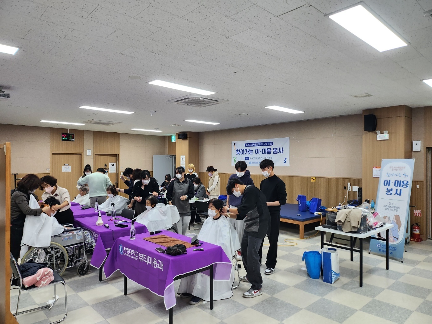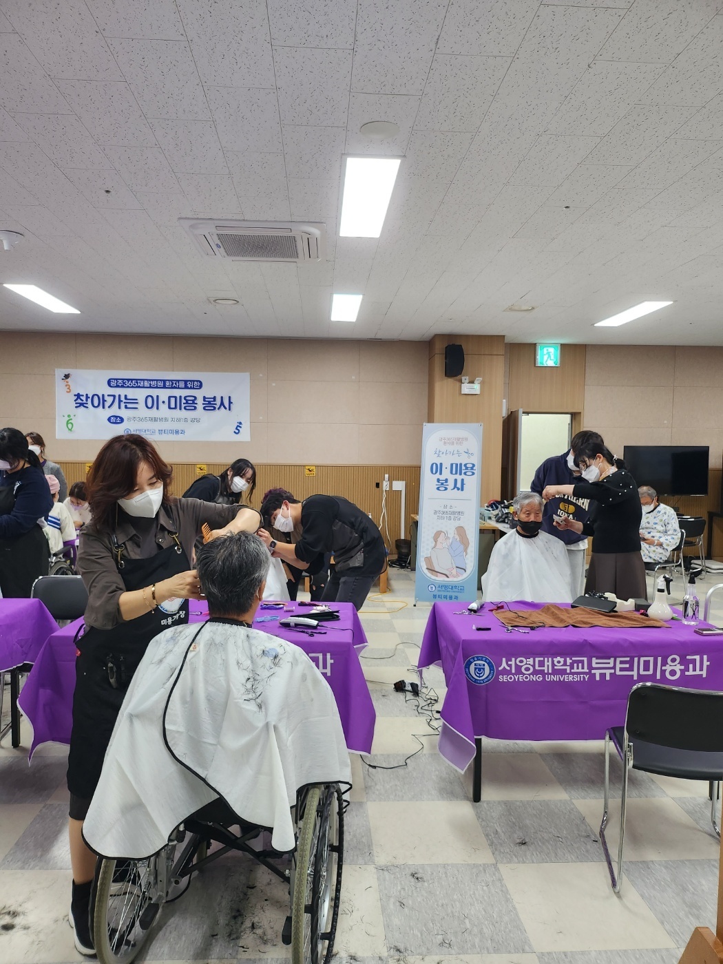 -이번 봉사는 뷰티미용과 SYBG(서영대학교 뷰티미용과의 성장)의 동아리팀에서 헤어커트 9명과 네일케어 2명이 교수님들과 함께 광주365재활병원에서 뜻깊은 봉사를 진행했다