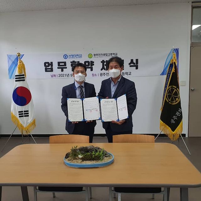 지난 21년 09월 17일 금요일날 서영대학교(총장 김정수)는 광주전자공업고등학교(교장 김용태)와 상호협력 업무협약 체결을 진행 하였습니다. 이번 업무협약을 통해 학교간 교육자원의 공유. 협력을 통해 신산업 분야의 전문기술인재 양성을 위한 고등교육 체계 조성 및 교육 관련분야 협력과 신뢰를 바탕으로 협약을 진행하였습니다. 광주전자공업고등학교는 광주에 위치하고 있으며, 1996년 개교 이후 전기과, 전자통신과, 에너지환경과, 디자인과, 자동차과, 자동화기계과 등 6개과가 개설되어있으며, '산학일체형 도제학교'를 운영하고 있습니다.