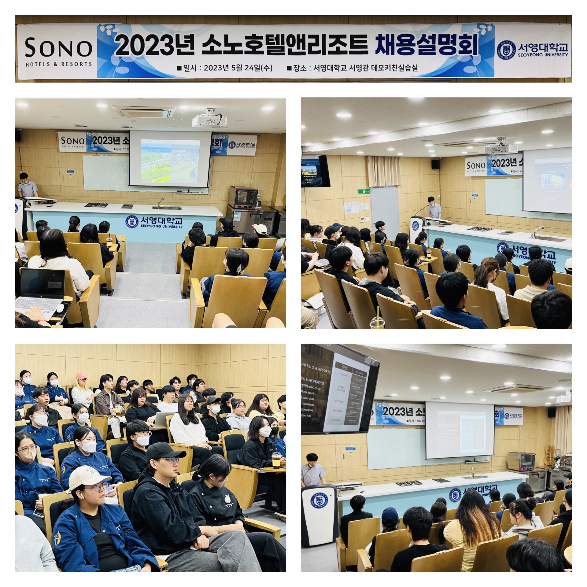 ○ 소노호텔앤리조트 채용설명회를 24일 교내 서영관 데모키친실습실에서 1,2학년 재학생 대상으로 진행되었다. ○ 소노호텔앤리조트는 국내 최대 호텔&리조트로 소노펠리체, 솔비치, 소노캄, 소노벨, 소노문, 소노휴 브랜드를 보유하고 있는 대명소노그룹 계열이다. 소노호텔앤리조트는 7~8월 여름 성수기를 앞두고 산학실습과 취업을 연계한 채용설명회를 진행하고자 호텔조리제빵과를 찾았다. ○ 권기완 호텔조리제빵과 학과장은 “코로나19로 인해 관광산업이 매우 위축되어 있었는데 국내 최대 규모의 호텔앤리조트 기업이 신입사원을 채용하기 위해 학교를 방문해준 것에 감사하다”며 “앞으로 다양한 우수한 기업의 채용설명회를 유치해 학생들의 다양한 취업처를 발굴하고 취업의 질을 향상 하겠다.”고 전했다.