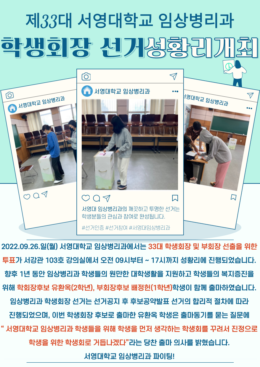 2022. 09. 26.(월) 서영대학교 임상병리과에서는 33대 학생회장 및 부회장 선출을 위한 투표가 서강관 103호 강의실에서 오전 09시 ~ 17시까지 성황리에 진행되었습니다. 향후 1년 동안 임상병리과 학생들의 원만한 대학생활을 지원하고 학생들의 복지증진을 위해 학회장후보 유환옥(2학년), 부회장후보 배정헌(1학년)학생이 함께 출마하였습니다. 임상병리과 학생회장 선거는 선거 공지 후 후보공약발표 선거의 합리적 절차에 따라 진행되었으며, 이번 학생회장 후보로 출마한 유환옥 학생은 출마동기를 묻는 질문에 “서영대학교 임상병리과 학생들을 위해 학생을 먼저 생각하는 학생회를 꾸려서 진정으로 학생을 위한 학생회로 거듭나겠다.”라는 당찬 출마 의사를 밝혔습니다. 서영대학교 임상병리과 파이팅!