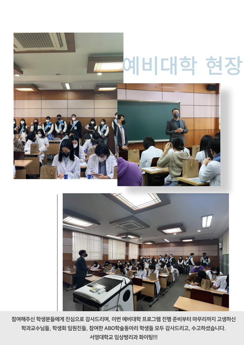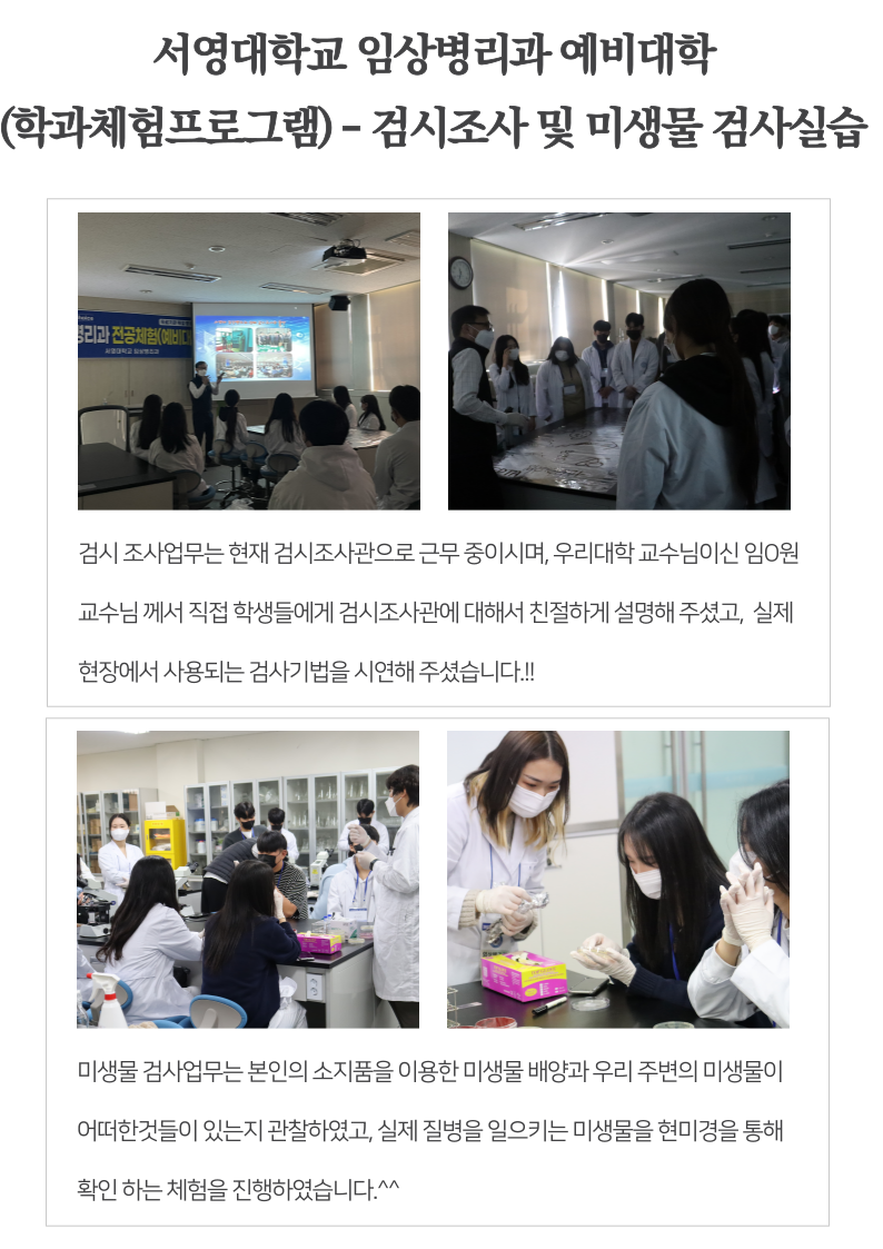 각 실습실에서 임상병리사의 업무(혈액 및 수혈 검사, 조직병리학검사, 미생물검사, 검시조사)를 직접 시연하고, 학생들이 직접 체험해 볼 수 있는 기회를 마련하였습니다. 분야별 검사의 체험활동은 교수님들 지도하에 ABO 학술동아리 학생들이 참여하여 더욱 더 큰 의미가 있었습니다. 예비대학 프로그램에 참여한 학생들에게는 소정의 선물 및 간식도 제공하였고, 학생들의 만족도도 매우 높았습니다. 이번 예비대학 학과 체험 프로그램은 안전수칙을 이행하여 아무 탈 없이 성황리에 성공적으로 마무리 되었습니다. 참여해주신 학생분들 에게 진심으로 감사드리며, 이번 예비대학 프로그램 진행 준비부터 마무리까지 고생하신 학과교수님들, 학생회 임원진들, 참여한 ABO 학술동아리 학생들 모두 감사드리고, 수고하셨습니다. 서영대학교 임상병리과 화이팅!!!