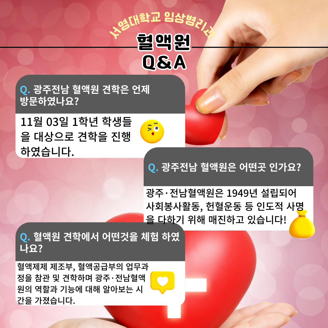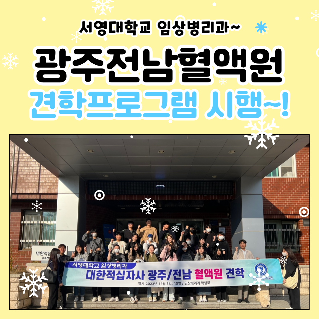 ○ 우리대학 임상병리과1학년 재학생을 대상으로 대한적십자사 광주전남혈액원 현장견학 프로그램을 실시했다. ○이번 견학은 임상병리과1학년 학생들의 전공학습역량강화를 위한 비교과 프로그램의 일환으로 광주전남혈액원을 방문하여 혈액제제 제조부,혈액공급부 등의 업무과정을 참관하며 그 역할과 기능을 이해하는 시간으로 마련됐다. ○조영국 임상병리과 학과장은“혈액원의 핵심 업무를 이해하고 채혈부터 혈액공급까지의 과정을 임상병리사의 시각에서 바라볼 수 있는 의미 있는 시간이 됐을 것”이라며“앞으로도 다양한 현장견학 프로그램을 마련해 임상병리사의 다양한 직무와 역할을 배울 수 있는 기회를 제공하겠다”고 전했다. ○한편 대한적십자사 광주전남혈액원은1949년 설립되어 광주전남지역 재해 이재민과 취약계층을 위한 긴급구호 활동,노인·장애인·다문화가정·저소득층 등을 대상으로 한 사회봉사활동,헌혈운동 등 인도적 사명을 수행하고 있다.