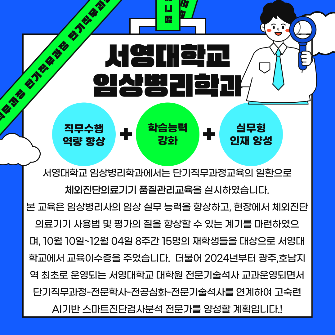 본 교육은 임상병리사의 임상 실무 능력을 향상하고, 현장에서 체외진단의료기기 사용법 및 평가의 질을 향상할 수 있는 계기를 마련하였으며, 10월 10일~12월 04일 8주간 15명의 재학생들을 대상으로 서영대학교에서 교육이수증을 주었습니다.  더불어 2024년부터 광주,호남지역 최초로 운영되는 서영대학교 대학원 전문기술석사 교과운영되면서 단기직무과정-전문학사-전공심화-전문기술석사를 연계하여 고숙련 AI기반 스마트진단검사분석 전문가를 양성할 계획입니다.!