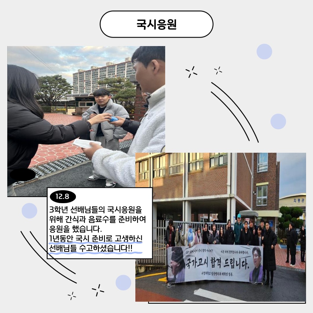 2024년 12월 9일에 제52회 임상병리사 국가시험이 진행되었습니다. 서영대학교 임상병리과 재학생일동은 3학년 선배님들의 국시 응원을 위해 간식과 음료수를 준비하여 응원을했습니다.