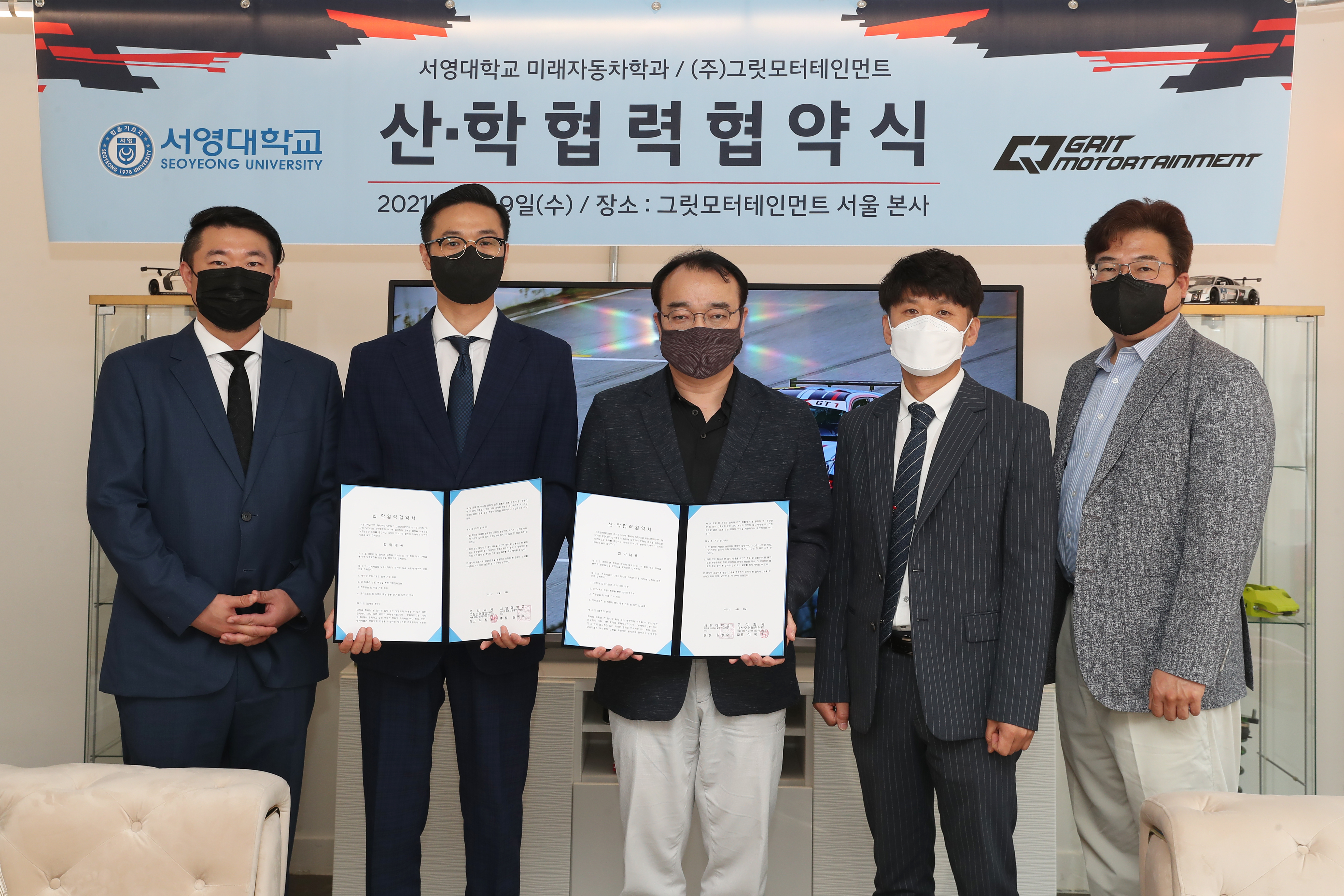 2021년 06월09일 서영대학교 미래자동차과와 그릿모터스포츠팀과 MOU를 체결하였습니다. 협약내용으로는 재학생 모터스포츠 참여 기회 제공, CEO(혹은 팀원)특강을 통한 산학인력교류, 현장실습 및 취업 기회지원, 모터스포츠 및 자동차튜닝 공동 연구 및 상호 간 교류 입니다. 이렇게 다양한 산업체 및 기업과 MOU를 통하여 재학생 및 졸업생분들에게 다양한 역량강화 기회제공, 많은 체험기회 등을 통하여 학훈인 재밋게 놀고, 재밋게 공부하자를 매일매일 실현하는 학과가 되겠습니다! MOU를 통해 재학생들에게 더 좋은 길을 열어주신 그릿모터테인먼트에게 감사드립니다~