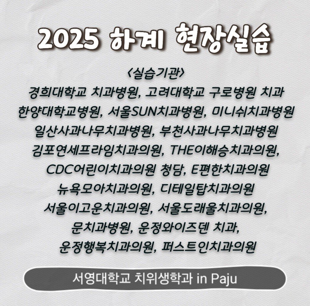 2025.6.23 ~ 2025.8.2 (6주간)경희대학교 치과병원, 고려대학교구로병원, 한양대학교병원, 미니쉬치과병원, 서울SUN치과병원, 일산사과나무치과병원, 부천사과나무치과병원 등 19곳의 치과 병, 의원에서 하계 현장실습이 진행되었습니다.